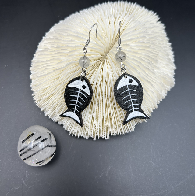 Boucles d’oreilles squelettes de poissons. Perles en quartz tourmaline. Boucles en bois découpées, peintes et vernies par mes soins. Montage acier inoxydable. Longueur totale environ 6 cm.